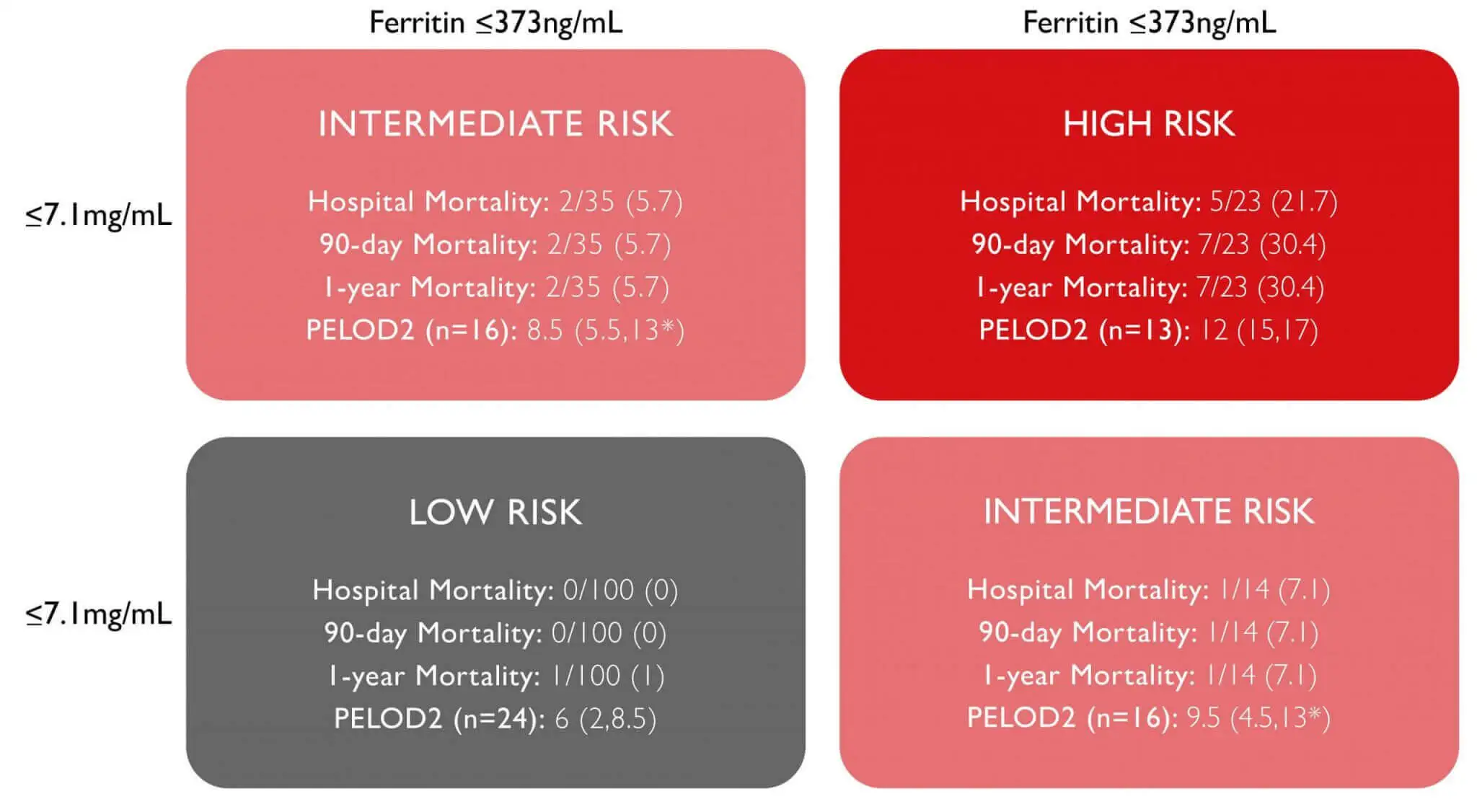 Elevated ferritin levels is associated with a poor outcome in patients with sepsis and can be used as a predictive marker of mortality along with current prognostic scores 4. Elevations of both ferritin and CRP during hospitalisation was associated with the highest mortality, followed by elevations of either biomarker alone (fig. 1) 5.
